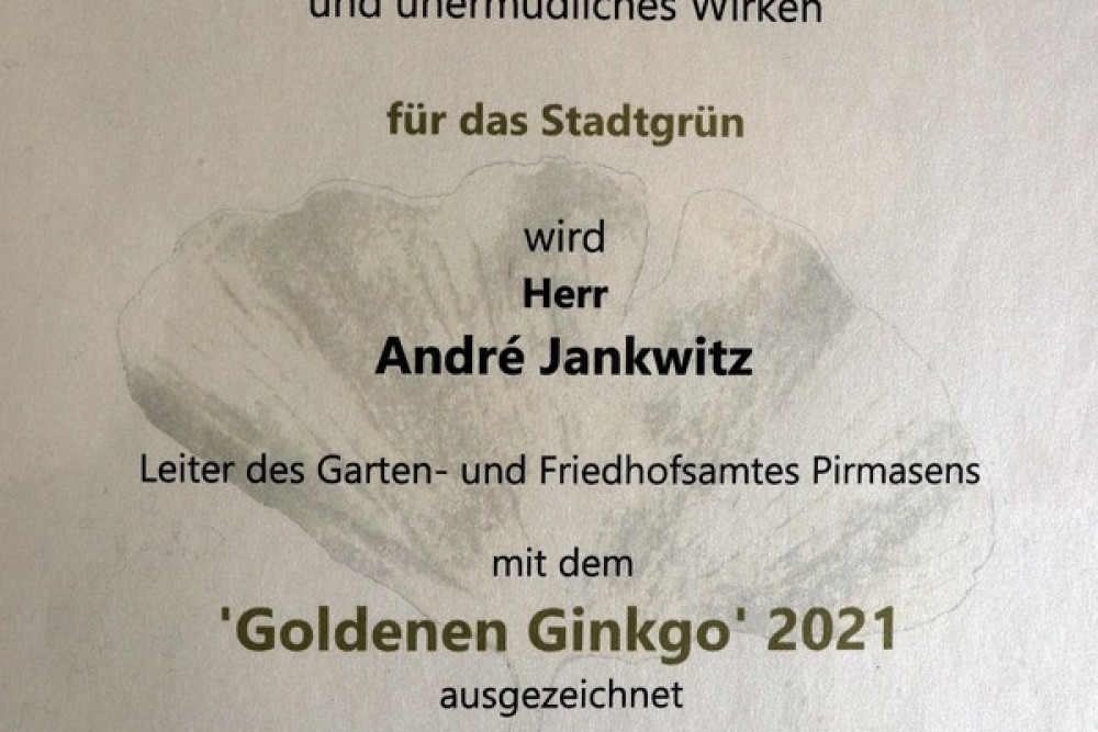 Der Leiter des Garten- und Grünflächenamtes der Stadt Pirmasens erhielt den Goldenen Ginkgo 2021. Mit dem Preis würdigt die Deutsche Gartenbau-Gesellschaft den 62-Jährigen für sein herausragendes Engagement auf dem Gebiet der Entwicklung und Gestaltung des öffentlichen Grüns. Die Verleihung fand wegen der pandemiebedingten Einschränkungen erst am 05. April 2022 statt. Zum Auftakt der Feierstunde wurde um 12.40 Uhr im Poissy-Garten des Strecktalparks ein Ginkgo-Baumes gepflanzt. Im Anschluss fand die Veranstaltung im Forum Alte Post ihre Fortsetzung.