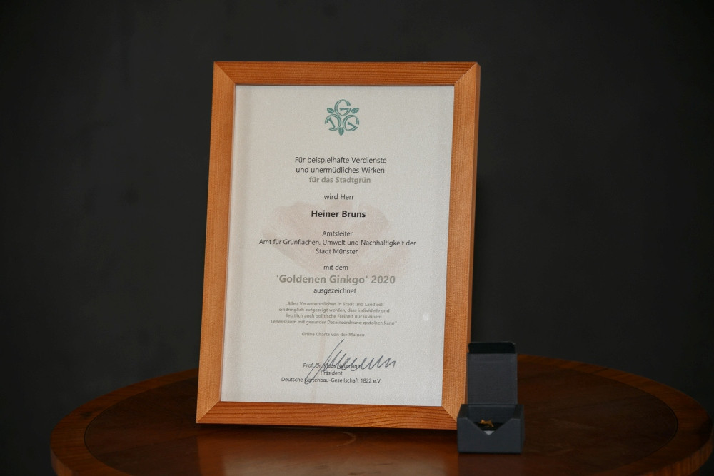 Dipl.-Ing. Heiner Bruns, Amtsleiter im Amt für Grünflächen, Umwelt und Nachhaltigkeit der Stadt Münster, wurde im Jahr 2020 mit dem Goldenen Ginkgo geehrt. Heiner Bruns, zunächst Amtsleiter des Umweltamtes der Stadt Dorsten, wechselte im Jahr 1999 nach Münster, wo er zunächst das Umweltamt übernahm und seit 2002 das Amt für Grünflächen, Umwelt und Nachhaltigkeit leitet. Seither reihen sich für Münster die oft auch internationalen Auszeichnung aneinandere, mit Titeln wie: „Lebenswerteste Stadt der Welt“, „Bundeshauptstadt für Klimaschutz“ oder „Fahrradhauptstadt“.