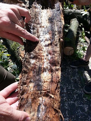 Symptom der Komplexkrankheit – ausgeprägtes Myzel unter dem abgestorbenen Rindengewebe