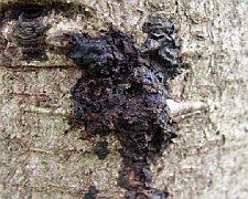 Abb.8 eingetrockneten Leckstellen sind den Fruchtkörpern des Brandkrusten-Pilzes sehr ähnlich. Zudem zeigen sich häufig und vorrangig am Stamm Pilzfruchtkörper, offensichtlich als Sekundärschädlinge. In der Folge treten vermehrt Astabbrüchen, aber auch großflächige Rindenablösungen auf und viele Bäume sterben rasch ab.