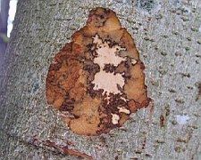 Stärkere Befälle verursachen hingegen ein streifenförmiges Absterben der gesamten Rinde und der darunter liegenden Gewebe. Die Streifen sind häufig wenige Zentimeter breit und können mehrere Meter lang sein, die von den Seiten her überwallt werden. Der Holzkörper weist dann Verfärbungen auf. Im Extremfall befinden sich mehrere, auch breitere Totstreifen an einen Stamm oder der Baum