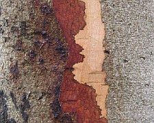 Abb.5 Das befallene Phloems ist orange-braun bis rötlich und ungleichmäßig, mosaikartig verfärbt. schwärzlichen, krustigen Flecken auf der Rinde aus. Im Bereich der Leckstellen verfärbt sich die Rinde häufig bräunlich (Abb. 4). Legt man derartige Stellen vorsichtig mit einen scharfen Werkzeug frei, zeigt sich darunter im Bereich des Phloems, anders als bei einem Phytophthora-Befall, eine besonders intensive orange-braune bis rötliche Verfärbung, die in sich sehr kleinteilig mosaikartig zoniert ist (Abb. 5). Der Übergang zum gesunden Gewebe ist scharf abgegrenzt und verläuft unregelmäßig (Abb. 6). Die abgestorbenen, verfärbten Bereiche bleiben über längere Zeit auf die Rinde begrenzt und reichen zunächst nicht bis in den Holzkörper. In der Rinde sind die befallenen Bereiche durch bereits makroskopisch deutlich erkennbar rot gefärbte Periderme von den gesunden, noch lebenden Bereichen der Rinde getrennt (Abb. 9).