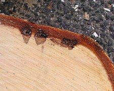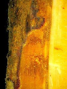 Abb.7 Befall bis zum Holz führt auch hier zu Verfärbungen. stirbt halbseitig ab. Häufig haben diese Bäume noch weitere Schäden oder einen Befall von Sekundärschädlingen, z.B. Armillaria. Hierdurch ist dann auch oftmals die Verkehrssicherheit beeinträchtigt oder es kann sogar zum Absterben des Baumes führen (Abb. 2).