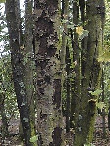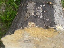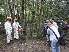 Die Rußrindenkrankheit wird durch einen Pilz verursacht, von dem noch keine Hauptfruchtform bekannt ist. Betroffen sind bisher in erster Linie der Bergahorn, seltener Spitzahorn und Feldahorn. Ein Befall macht sich zunächst durch längliche Risse in der Rinde und Schleimfluss am Stamm bemerkbar. Dann verwelken die Blätter, fallen ab und in der Krone sterben Äste ab. Der Baum stirbt ab, oft innerhalb nur einer Vegetationsperiode, seine Rinde reißt auf und ein ausgedehnter, Abb.1+2 Pressetermin am 26.07.2010 zur Russrindenkrankheit in Kölnschwarzer, rußartiger Belag wird sichtbar. Diese vom Pilz gebildeten Sporenlager geben der Krankheit auch ihren Namen. Im Splintholz zeigen sich großflächige, blaugrüne Verfärbungen.
