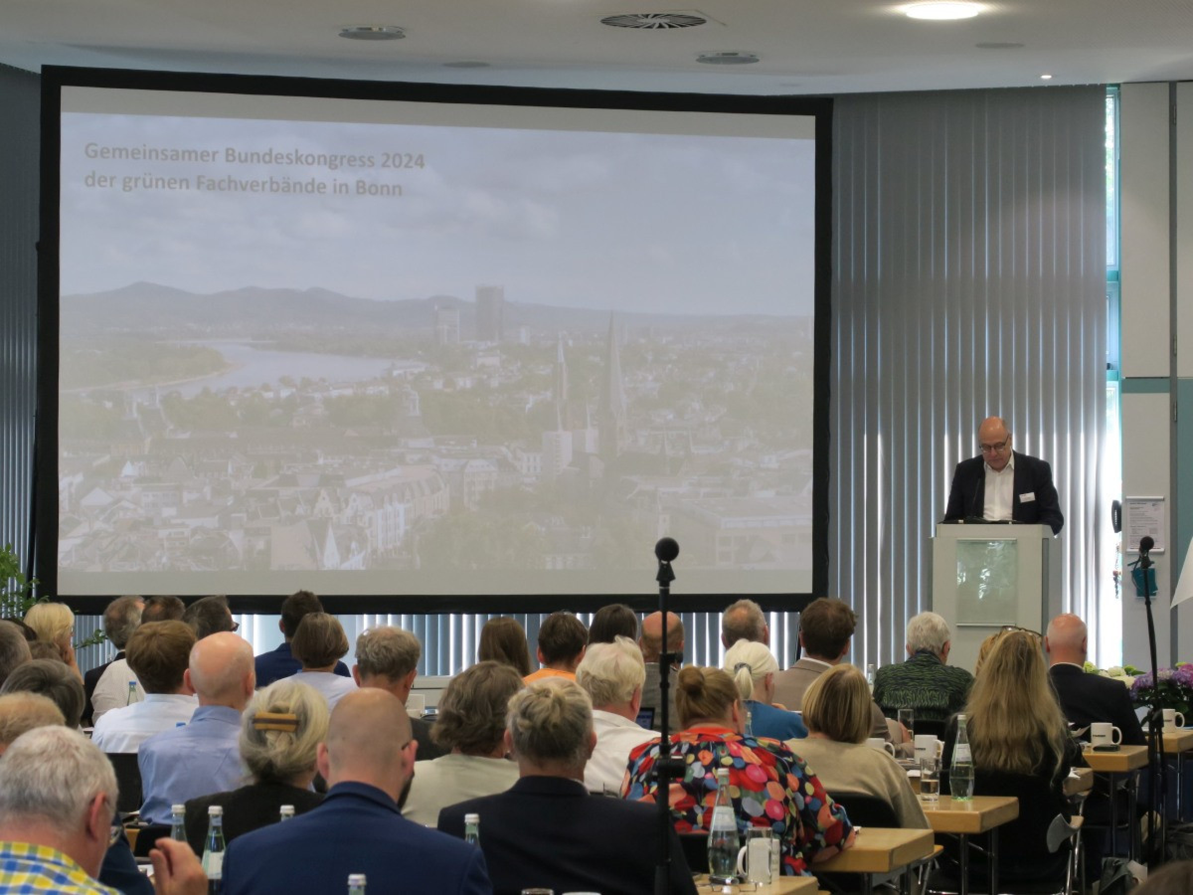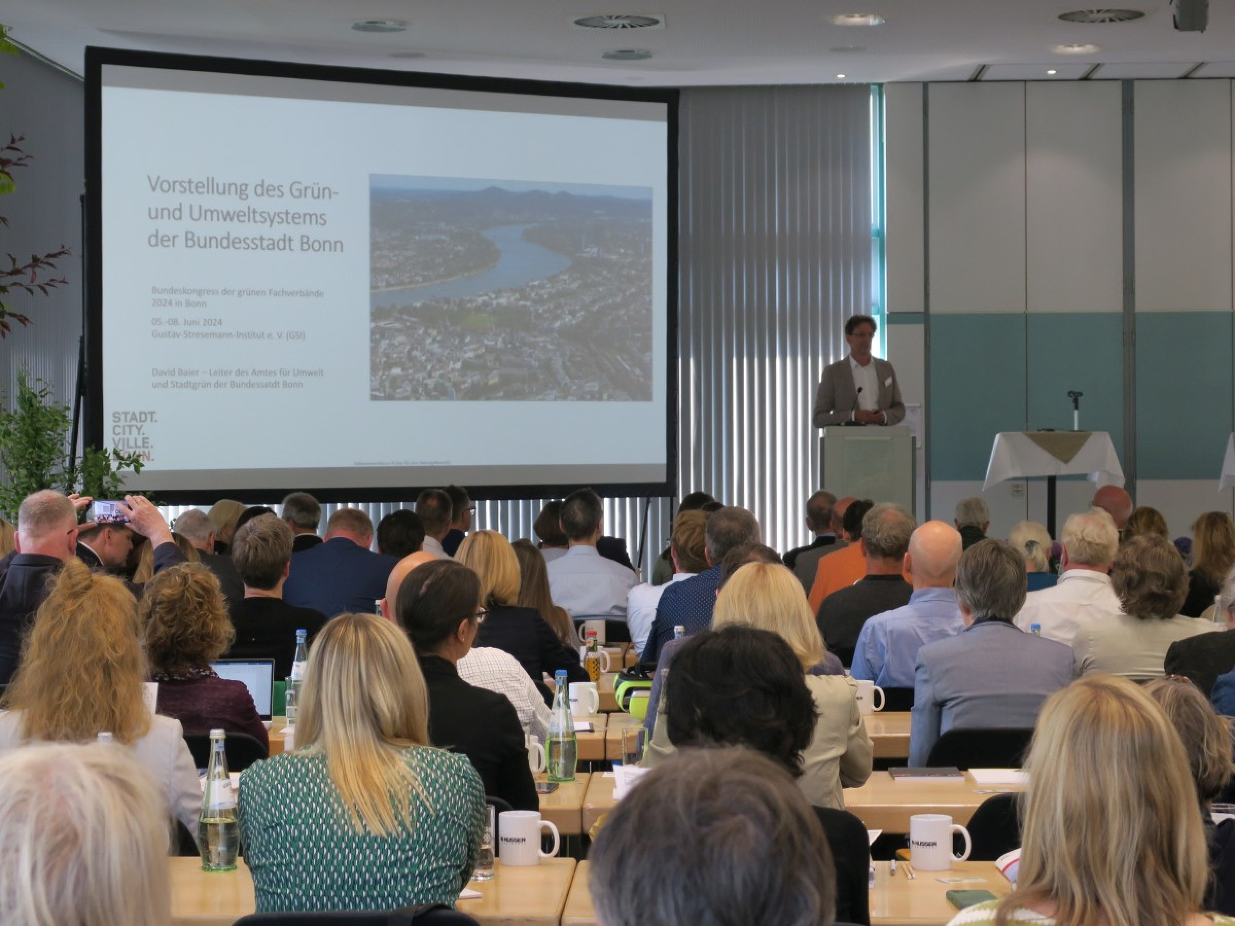 Vom 05. – 08. Mai 2024 trafen sich Vertreterinnen und Vertreter aus Verwaltung, Politik, Wissenschaft, Planung sowie aus der grünen Branche in Bonn, um unter dem Motto „Klimaanpassung – kommunal erfolgreich umsetzen“ Signale für fachliche und für politische Entwicklungen zu setzen. Eingeladen und organisiert hatte die Tagung der GALK der Bonner Preisträger des Goldenen Ginkgo Dieter Fuchs, Geschäftsbereichsleiter Stadtgrün im Amt für Umwelt und Stadtgrün Bonn.