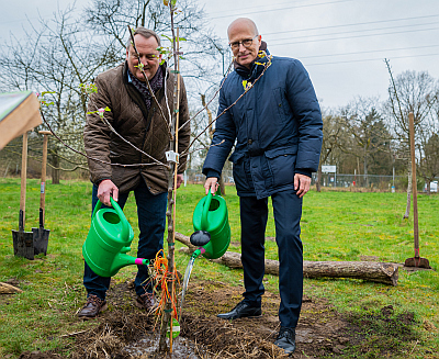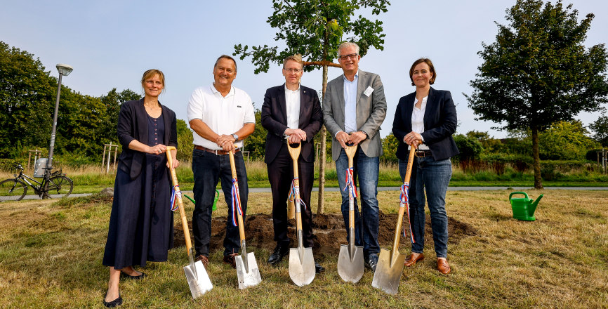 (v.l.n.r.) Marc Fielmann, Vorstandsvorsitzender der Fielmann Group AG; amtierender Bundesratspräsident Dr. Peter Tschentscher; Bezirksamtsleiterin von Hamburg-Altona, Dr. Stefanie von Berg; Eugen Witte, Vorstand von Einheitsbuddeln e.V.